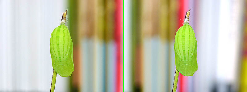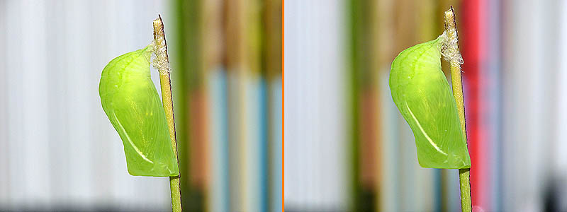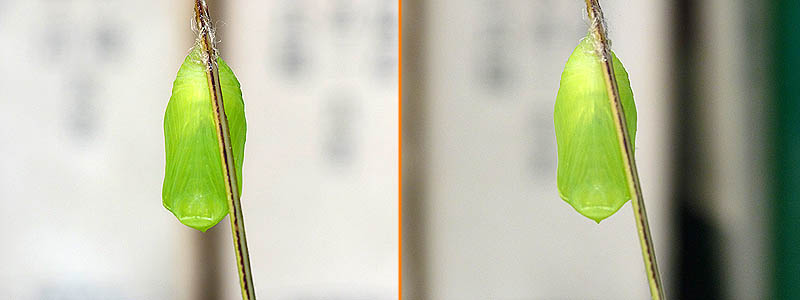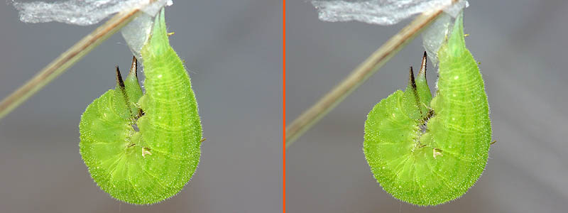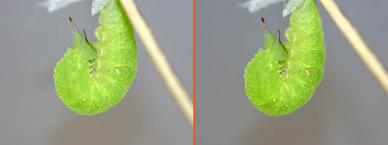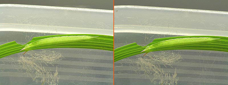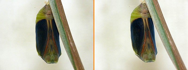 写真(1)(2):最も育ちが速いものが前蛹になったので交差法の立体写真にしてみました。 (2010年5月22日) 前蛹のぶら下がっているものはススキの葉の軸です。前蛹になるときに上手に糸の台座を張れず、容器の底に落ちてしまいました。こんな時のために私はそれまでに飼育した各種幼虫が吐糸した糸の束を容器から剥がして取ってあります。 落ちた前蛹や蛹の尾端の微細なカギに糸の束を引っかけ、うまく引っかかったらそこを木工用のボンドで固めてしまいます。それで羽化まで二度と落ちることはありません。 写真(3):別の1頭が容器の蓋で前蛹になりました。この子はうまく自分でぶら下がれたようです。 前の前蛹から11日経過しています。途中で食べなくなる子が居るので、こんな風に育つ日にちがどんどんズレていきます。結局は食べなかった子もまた何事もなかったかのように食べ始めるんですけど.... (2010年6月2日) |