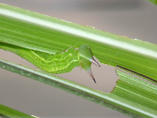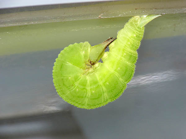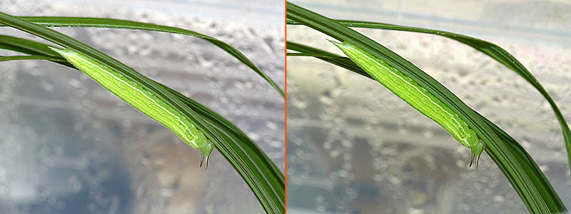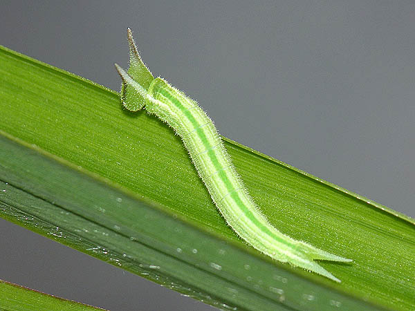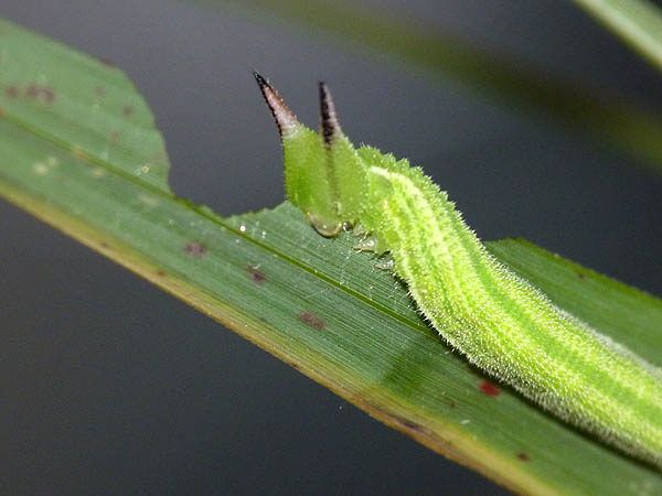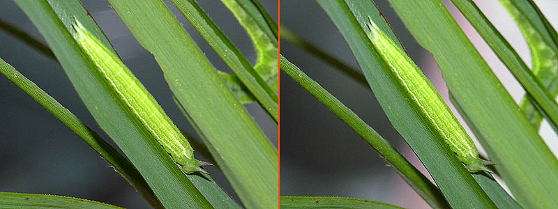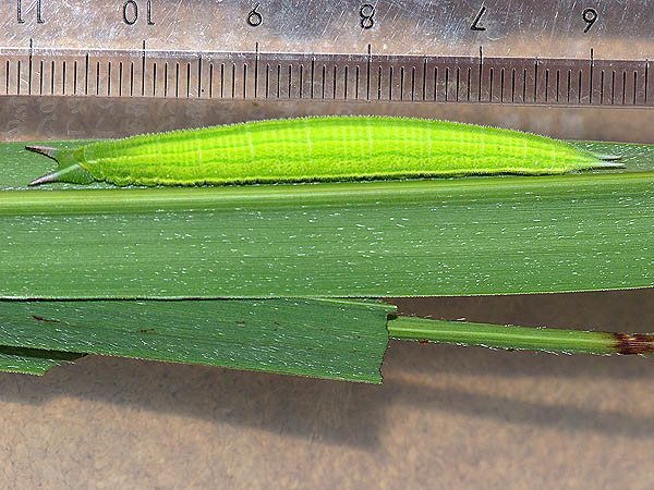 写真(1):葉裏で静止休憩していた5齢幼虫の大きさを測ってみました。53mmです。結構デカいですね。 ちなみにこのページで写真で紹介しているものは、ほぼ順調にエサを食べて育ったものばかりを選んでいます。エサを食べずに生育が遅いものを待っていられないので。 (2010年5月20日) 写真(2):こちらは摂食中の5齢幼虫です。食べるときはモリモリ食べます。同じイネ科食いでもウラナミジャノメやヒメウラナミジャノメのようにスローモーションのような食べ方はしません。 (2010年5月22日) |