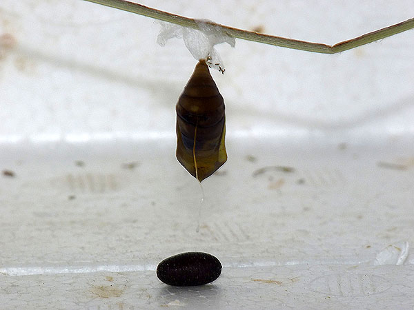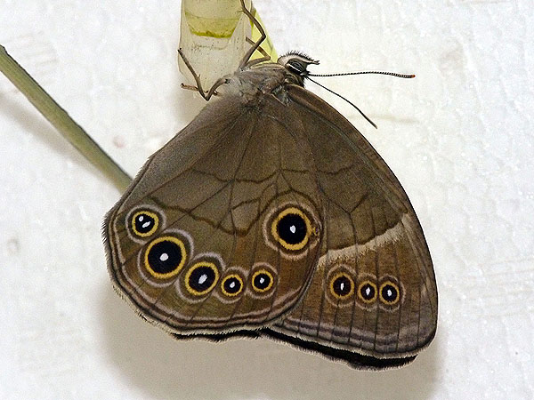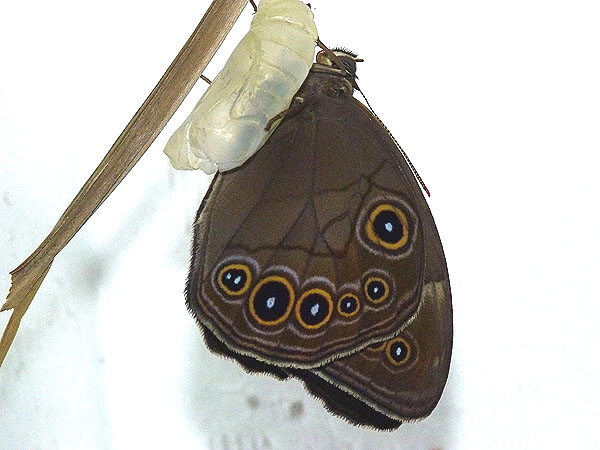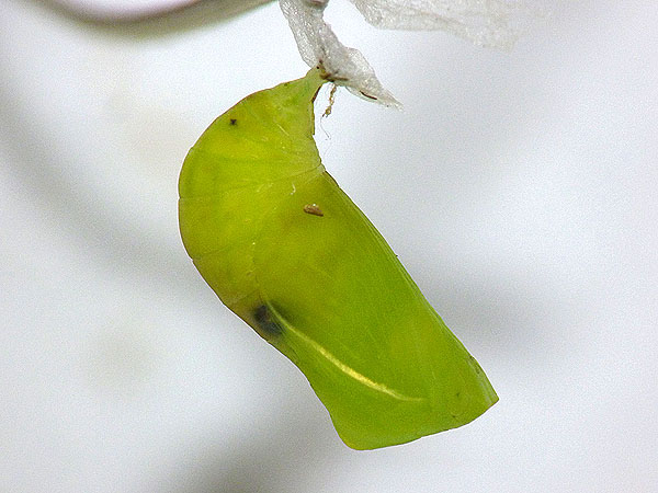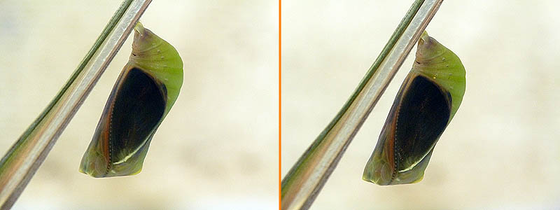 写真(1):最初に前蛹になった子が蛹化したら背中に黒い影が... これは中に寄生昆虫がいる証拠です。 (2010年5月26日) 写真(2):それから4日後にやはりハエの幼虫が出てきて蛹化していました。通常なら次の日くらいには蛹化するんですが、ハエの幼虫が蛹の中を食べるのに4日費やしたようです。 ハエはチョウと同じ完全変態なので蛹化しますが、チョウや甲虫のように脱皮するわけではありません。幼虫がそのままの形で前後に縮んでその後固化して黒褐色になります。これがハエの蛹化です。 本来ならどんなハエかを調べるといいのでしょうが、憎い敵を生かしてはおけませんので、三角コーナーのゴミの中で熱湯浴びの刑に。 (2010年5月30日) 写真(3)〜(5):死んだ子と同様に落ちてしまった蛹を糸の束でススキの葉の軸に固定して、背面・側面・腹面から交差法の立体写真にしました。まるでヒスイのようにきれいです。 (2010年6月3日) 写真(6)〜(7):翅の色が出た最初の個体です。翅や復顔、脚、触角などが見えるよう、側面と原面から交差法の立体写真にしました。 (2010年6月8日) |